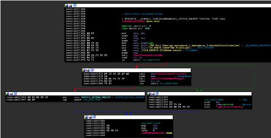 如果文件名被拒绝,则处理程序将返回STATUS_ACCESS_DENIED并停止IRP的处理。否则,它将把它传递给设备堆栈中的底层驱动程序。