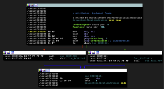 该恶意软件的内核模式组件是传统文件系统过滤器驱动程序,与更现代的迷你过滤器驱动程序不同,它可以在不使用回调过滤函数(如操作前回调例程或操作后回调例程)的情况下修改系统行为。