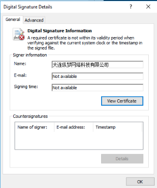 颁发给“大连龙梦网络科技”的证书,用于签名驱动程序