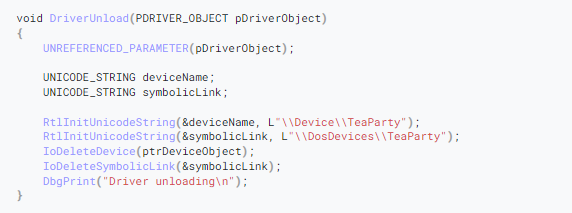 此处理程序函数的目的是清除驱动程序在初始化和执行过程中创建的任何资源,例如,删除在DriverEntry中创建的设备和符号链接。