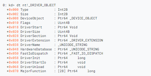 例如,以下结构是DRIVER_OBECT(代码段4)。