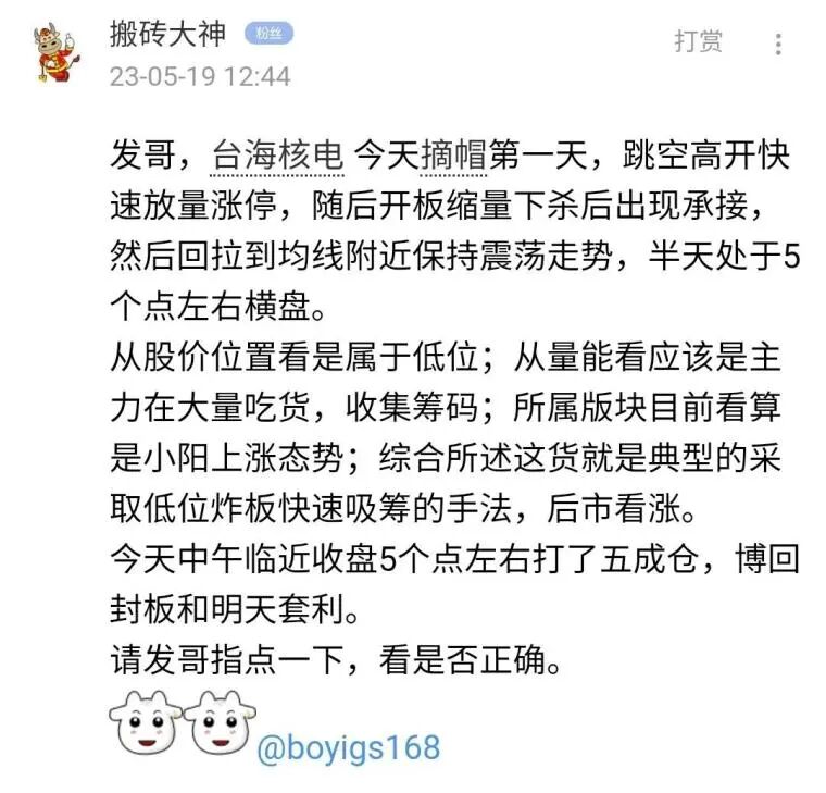 还有一个是台海核电,是我的一个铁粉@搬砖大神 在帖子里留言被我留意到的,所以讨论是可以擦出认知的火花的,我算是包大腿了,我们认识两年多,他是个非常爱学xi龙公战法和龙头战法的朋友。 @搬砖大神的这段话非常值得大家去学。