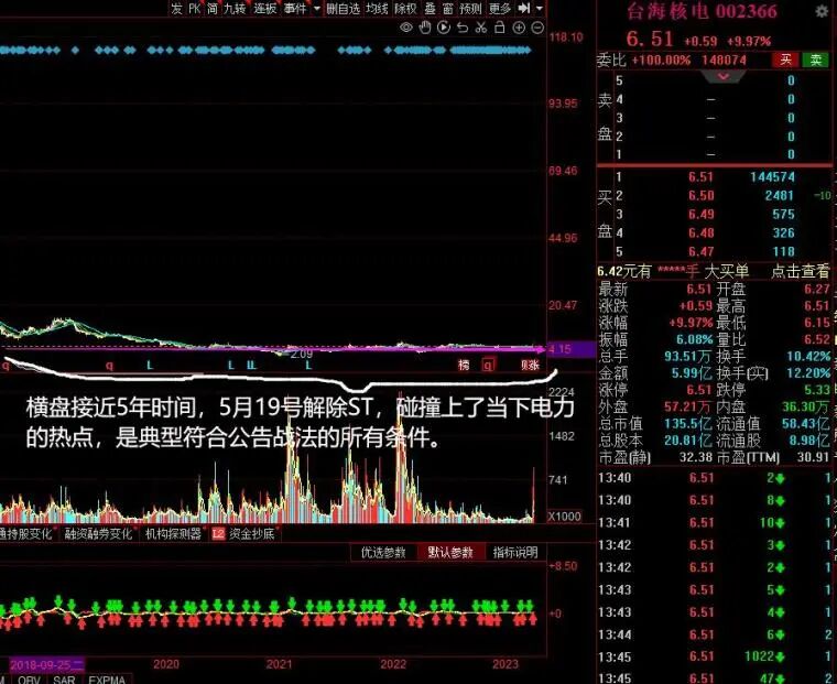 上面两个股,一个是典型的龙头战法(杭州热电),一个是典型的公告战法(龙公战法,台海核电)