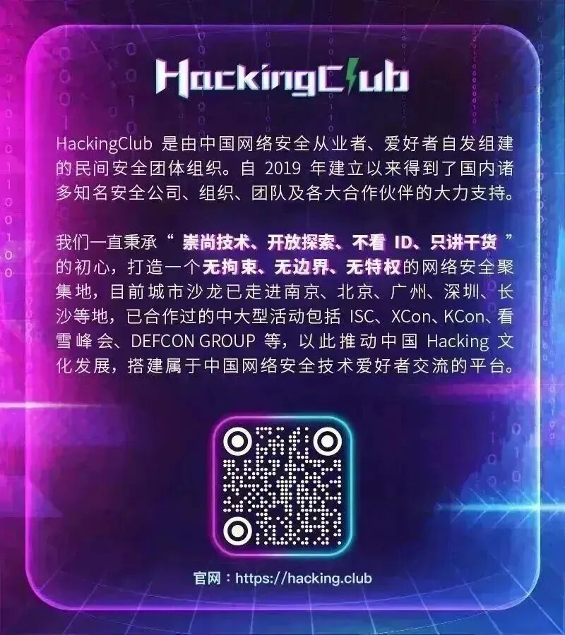 HackingClub城市沙龙提倡纯粹,鼓励碰撞,这几年以来,我们走过了深圳、广州、长沙、北京、南京、郑州等城市,干货满满,潮酷有趣,备受广大网络安全技术爱好者关注,多场线下沙龙都成功举办,报名人数激增,活动现场爆满,如今,济南站成功举办,让我们共同期待下一场吧!会不会就是你的城市呢~
