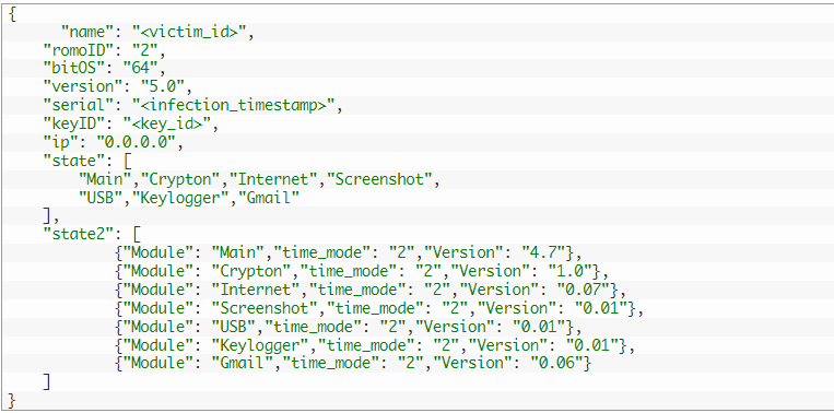 启动模块后,Orchestrator开始通过发送检测信号消息与攻击者通信。每次检测信号都是一个JSON文件,包含受害者信息和加载模块列表: