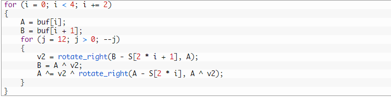 恶意软件作为一个名为“syncobjsup”的可疑Windows服务运行。该服务是由一个同样可疑的路径“C:\ProgramData\Apparition Storage\syncobjsup.dll”的DLL控制的。执行时,我们发现该DLL可以解密与该DLL位于同一目录中的文件mods.lrc中的数据。用于解密的密码是RC5,密钥为88 6A 3F 24 D3 08 A3 85 E6 21 28 45 77 13 D0 38。然而,使用标准RC5实现对文件进行解密只会产生垃圾数据。仔细研究样本中的RC5实现就会发现它存在漏洞: