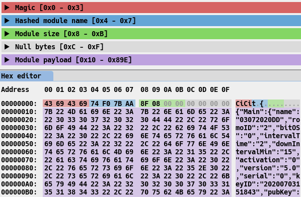 这个VFS中的每个条目都包含魔术字节(' CiCi '),条目名称的ROR6哈希,以及条目大小和内容。
