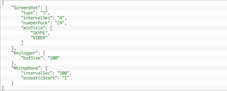 7.用于截图的模块使用相同的窗口名称列表来触发截图频率的增加:“Skype”和“Viber”。CloudWizard和Prikormka的截屏间隔使用相同的默认值(15分钟)。
