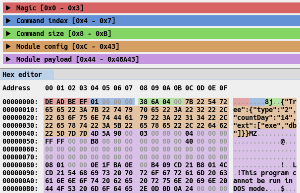 作为对检测信号的响应,Orchestrator接收允许其执行模块管理的命令:安装、启动、停止、删除模块或更改其配置。每个命令都包含魔术字节(DE AD BE EF)和一个JSON字符串 (e.g., {“Delete”: [“Keylogger”, “Screenshot”]}),后面跟着一个模块DLL文件。