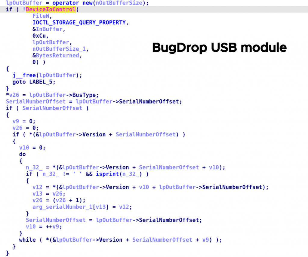 6.CloudWizard的几个模块实现类似于Prikormka和BugDrop模块的相应模块,不过由C变成了c++,USB窃取模块通过IOCTL_STORAGE_QUERY_PROPERTY系统调用检索连接的USB设备的序列号和产品ID。运行失败的默认回退值为“undef”。