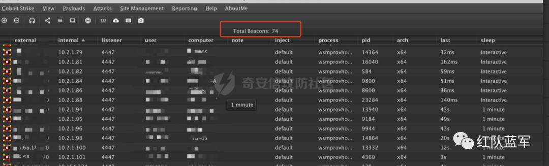 因为前面已经拿到了100多台机子的权限,所以能想到的第一个思路就是把100多台主机上的hash都进行一个抓起取,然后看是否可以抓到域管的账号,但是这里抓完之后会发现,没有一台域管是上线的,所以这里也比较无语。
