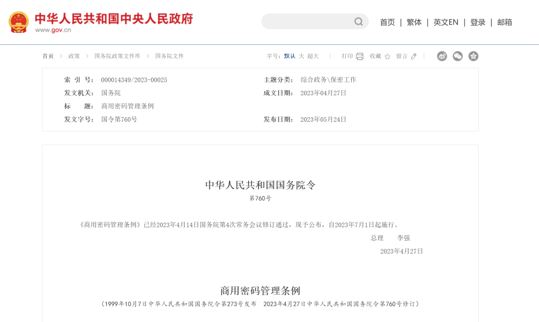 《商用密码管理条例》已经2023年4月14日国务院第4次常务会议修订通过,现予公布,自2023年7月1日起施行。
