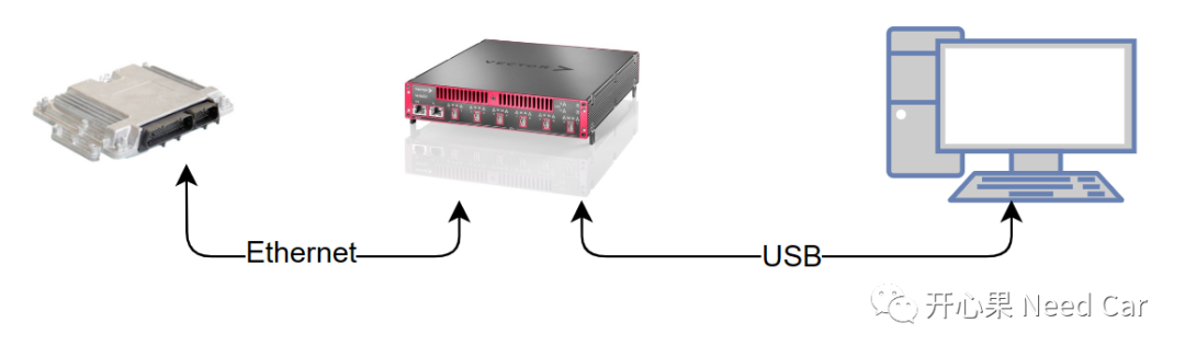 其中,DUT与VN5650硬件接口卡通过以太网连接。对于DUT,一般使用双绞线,与仿真设备连接时,可以使用转换接口,转换成RJ45与VN5650的RJ45连接器连接,也可以粗暴地直接双绞线连接。VN5650与PC端通过USB连接。