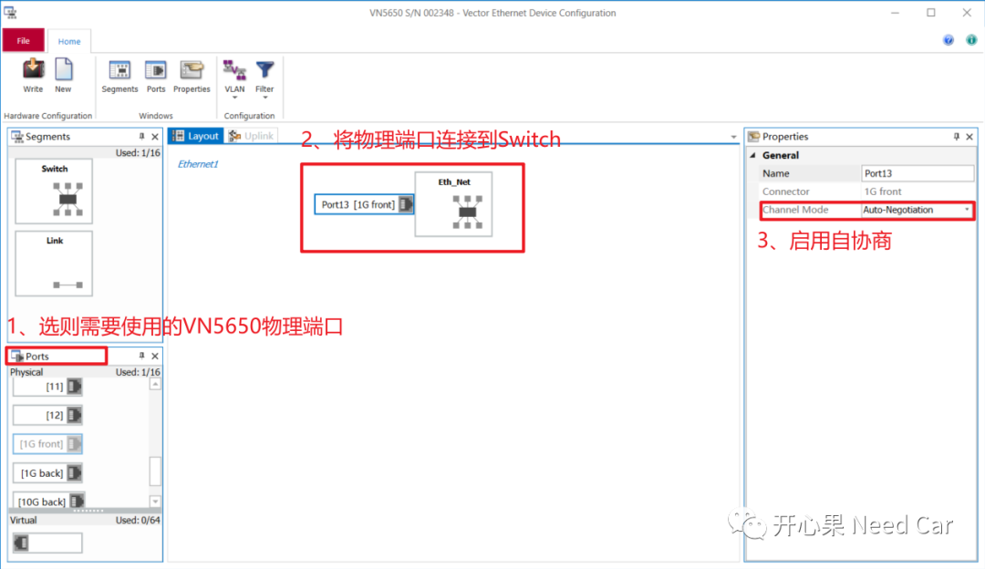 选择Port口,此处选择要使用的VN5650物理端口(PP),本文仅使用Port13[1G front],即:目标DUT与VN5650通过RJ45连接,至于Ethernet的通信速率,使用默认的自协商(Auto-Negotiation)方式即可,配置如下: