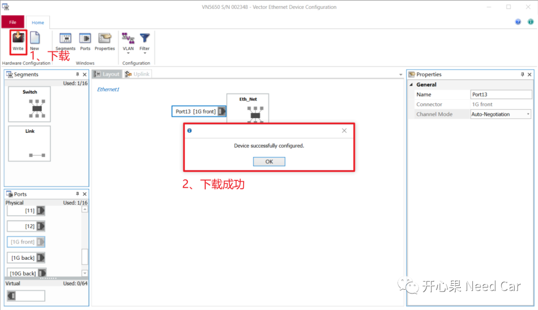 配置好网络以后,将配置好的网络下载到VN5650设备中,成功配置网络到VN5650后,提示如下: