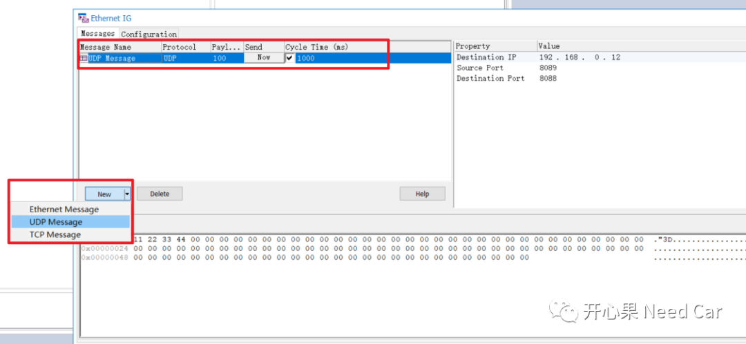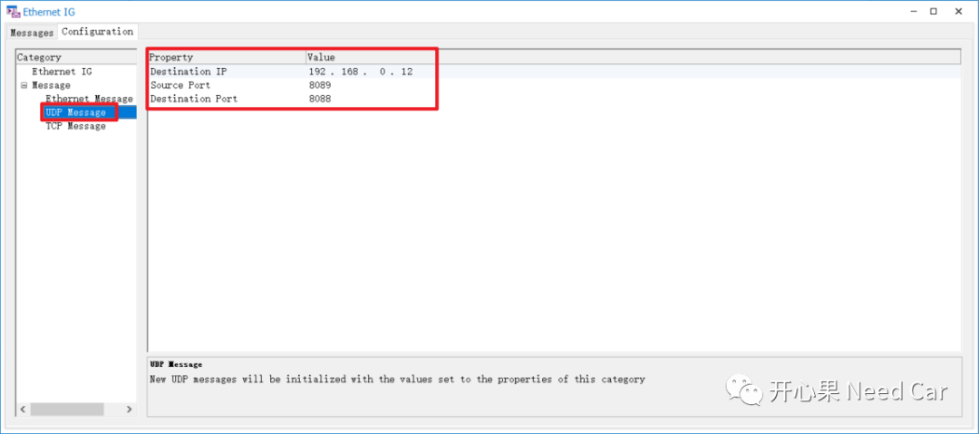 本文配置UDP报文发送属性,发送的目标IPv4地址:192.168.0.12,目标端口号:8088,IG端口号设置为:8089,如下所示: