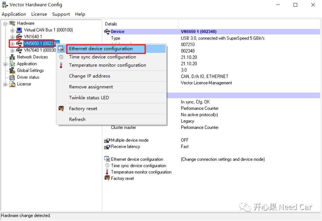 在Vector Hardware Config的配置界面选择VN5650,右击->选择"Ethernet device Configuration",如下所示: