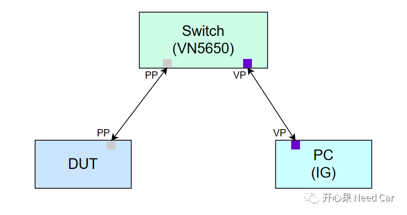 工程中,开发的节点(DUT:Device Under Test)支持Ethernet,开发过程中需要测试其通信状态。DUT、VN5650、监控设备之间的物理连接如下所示: