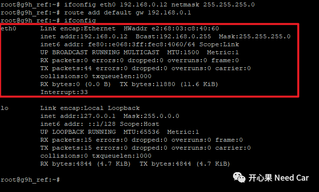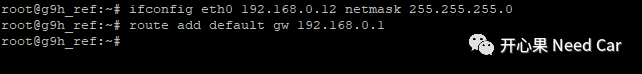 //配置网卡eth0的IPv4地址,网络掩码ifconfig eth0 192.168.0.12 netmask 255.255.255.0//配置默认路由地址route add default gw 192.168.0.1