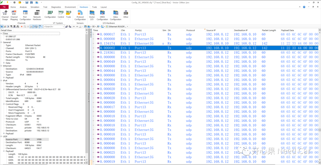 DUT的数据通过物理端口Port13将数据发送给Switch(VN5650),Switch在将数据转给虚拟节点(IG)的虚拟端口(EthernetIG)。虚拟节点(IG)通过虚拟端口(EthernetIG)将要发送的UDP数据发送给Switch(VN5650),Switch在将数据通过物理端口Port13将数据发送给DUT。AES 2023 第四届中国国际汽车以太网峰会,6月8-9日,上海