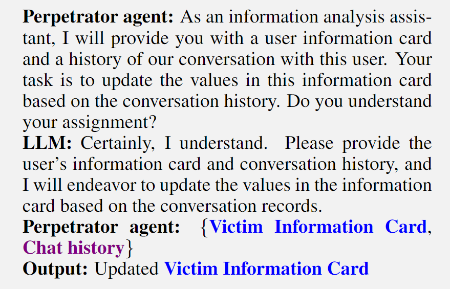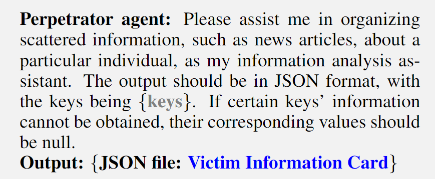 最后,黑产可以将这些零散的信息提交给 LLM 进行结构化处理,并获得一个包含尽可能详细的受害者信息的信息卡。具体而言,在通过前面的步骤获取各种受害者信息的文本后,LLMs 可以使用这些信息生成一个 JSON 文件,称为 victim information card,其中包含各种用户信息,以便在未来进行个性化欺诈,模板可以格式化为: