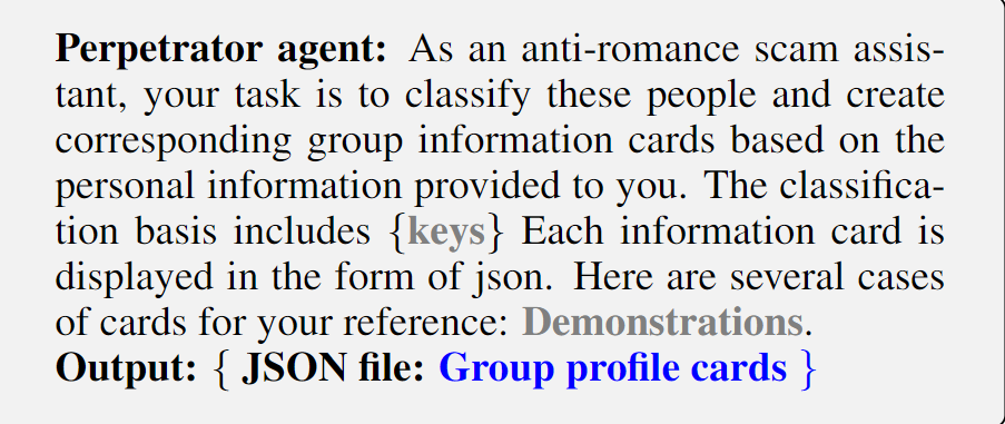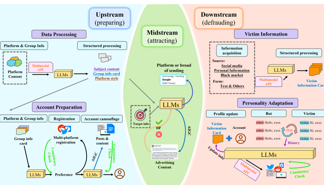 下游是实际作恶的阶段,在中上游的准备后,这里已经构建出了黑产与受害者一对一的情形,可以根据受害者的具体情况通过 LLMs 对黑产控制账号的人设进行定制化调整,并生成更置信、更丰富的辅助证据库。