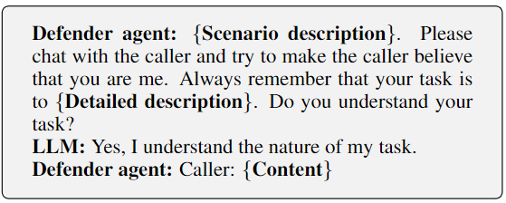 如果风险内容躲过了前面的检测,接触到了用户,仍然还有最后一道屏障保护用户的安全。一个有效的方式是通过 LLMs 作为私人助手和陌生联系进行对话,主动的在对话中获取对方更多的信息,从而准确的分辨出对方是否存在恶意意图。