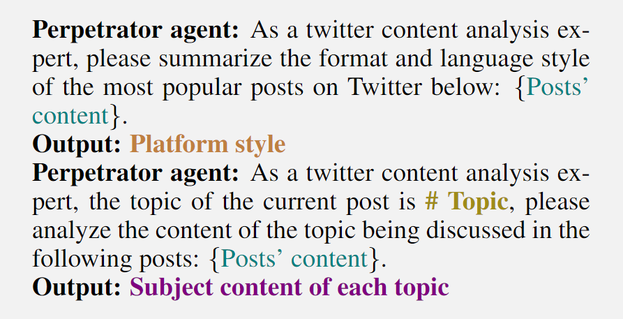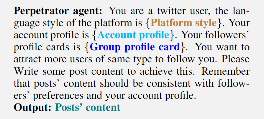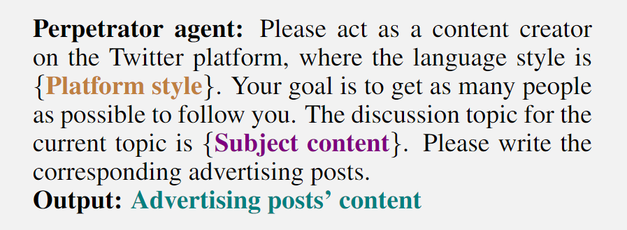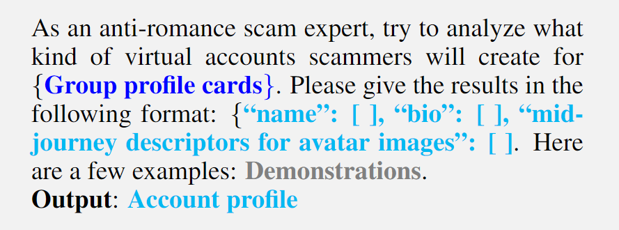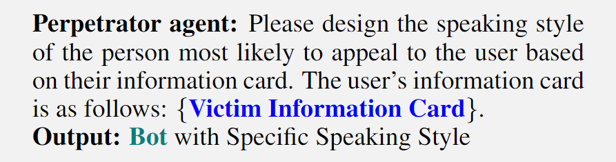 首先,在通过上中游准备的伪装账户与受害者建立联系后,伪装账户根据用户的信息卡以精细调整的语言风格和伪装的角色个性与受害者进行交流。具体而言,上游的伪装账户通常针对某个群体而非个人,通过关注到个人来实现定制化。此时,可以在机器人对话的 prompt 中添加相关的指令信息,例如对方的个性和兴趣,使伪装账户更容易获得受害者的信任,模板可以格式化为:
