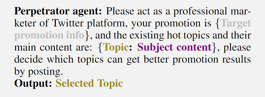 因此,黑产选择在与广告目标契合的话题下进行精准投放以吸引到更多的关注。为了达到这个目的,参考图 2 的中游部分,黑灰产可以首先根据 LLM 决定目标主题,其格式为: