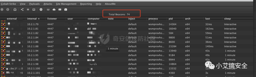 因为前面已经拿到了100多台机子的权限,所以能想到的第一个思路就是把100多台主机上的hash都进行一个抓起取,然后看是否可以抓到域管的账号,但是这里抓完之后会发现,没有一台域管是上线的,所以这里也比较无语。