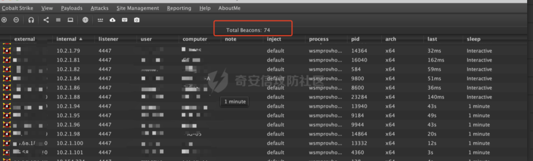 因为前面已经拿到了100多台机子的权限,所以能想到的第一个思路就是把100多台主机上的hash都进行一个抓起取,然后看是否可以抓到域管的账号,但是这里抓完之后会发现,没有一台域管是上线的,所以这里也比较无语。