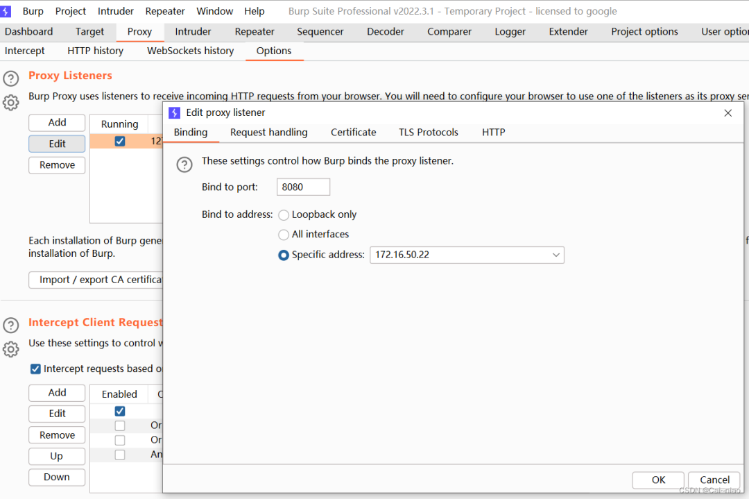 1、配置Burp和模拟器(模拟器需导入ca证书),打开模拟器的WLAN–>高级设置–>输入物理机的ip以及一个没被占用的端口,Burp用于代理该端口,我使用的模拟器安卓版本为5.0。