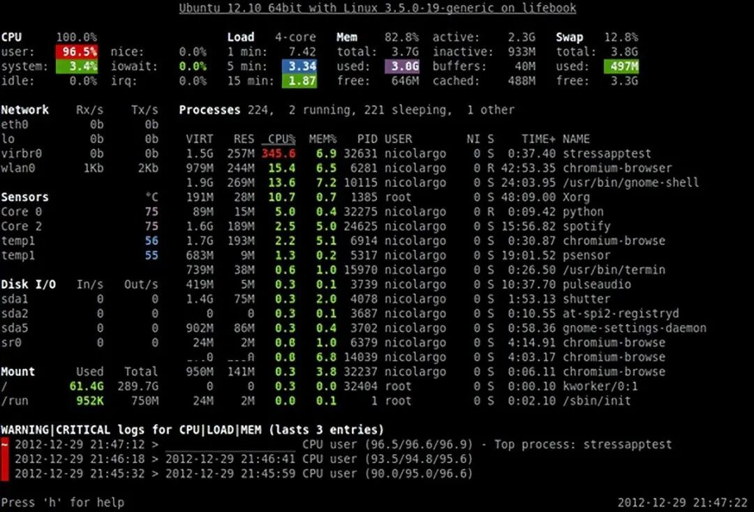 top:实时程序可帮助显示所有正在运行的进程,并为你提供一些简单的重要性信息,还能为您能够杀死不需要的进程。但是"top"这样的命令行工具,很难监控服务器CPU的使用情况和内存的使用情况。