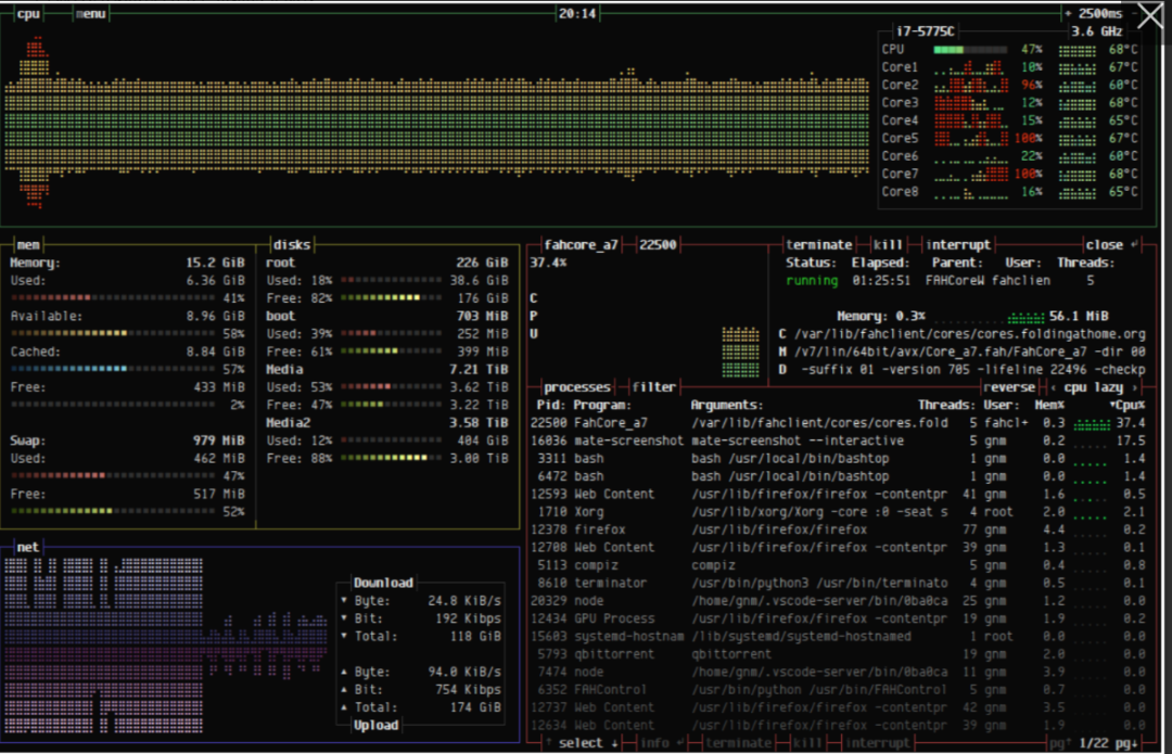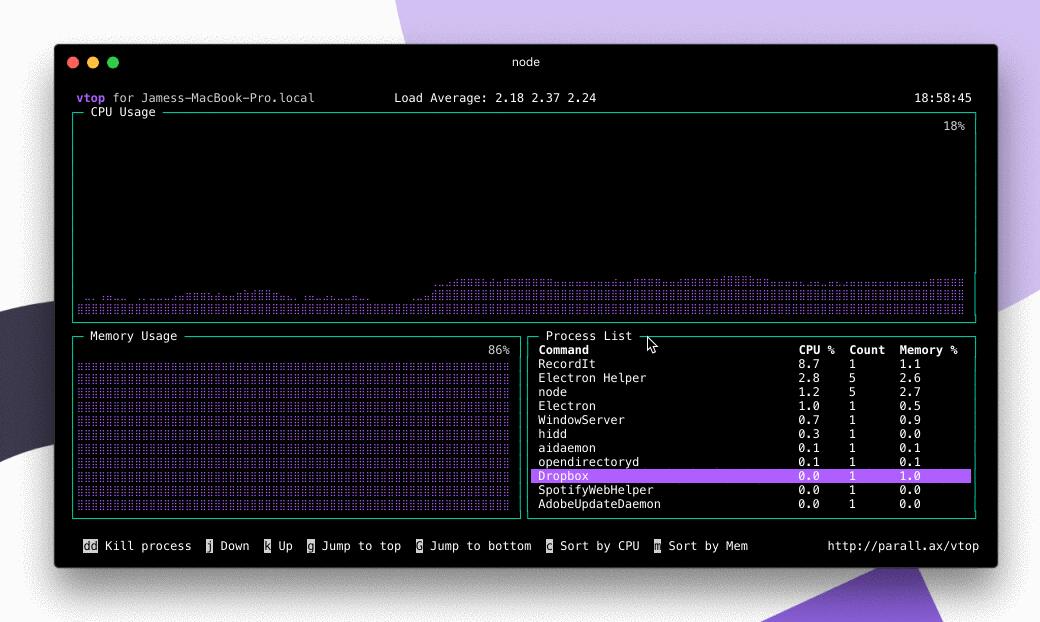 vtop 它是一个用 Node.js 编写的免费开源、简单而又强大的可扩展终端活动监控工具。它的设计目的是让用户轻松查看多进程应用(那些有主进程和子进程的应用,比如NGINX、Apache、Chrome等)的CPU使用情况,vtop还可以轻松查看一段时间内的峰值以及内存使用情况。