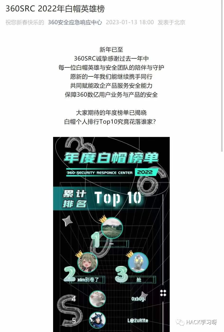 2022告一段落,在这里先祝各位师傅新春快乐,在新的一年里技术更上一层楼。在2022年对我而言很有纪念价值的一件事就是2022年的360SRC年榜第五。然后前言这块,我个人的一些感慨就照搬朋友圈内容了: