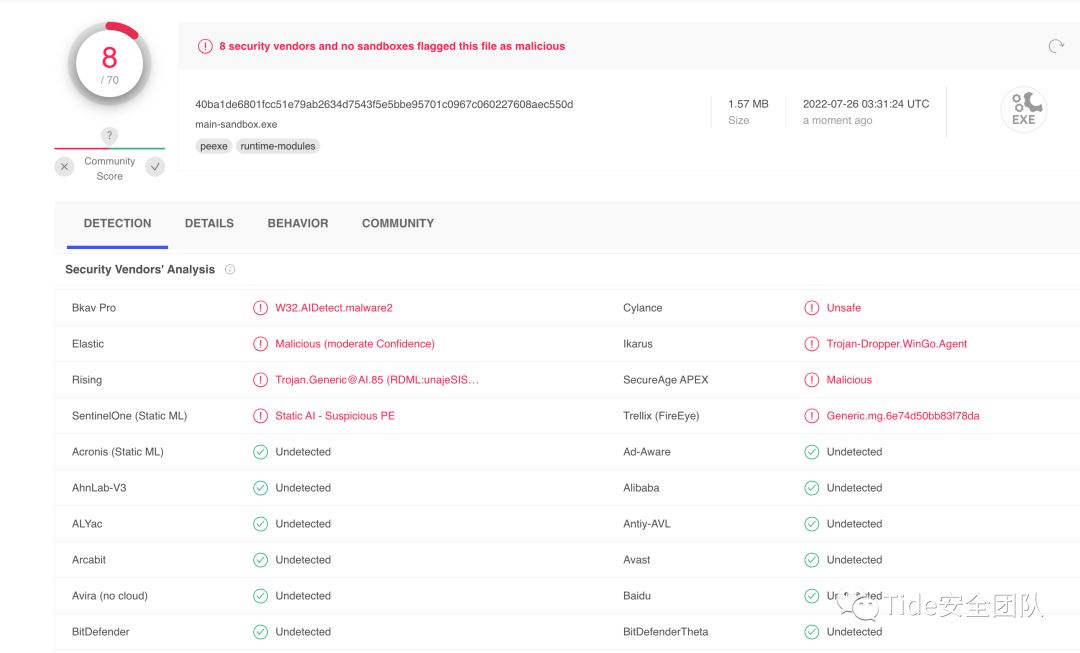 使用了沙箱检测技术的,VT查杀结果为:8/70
