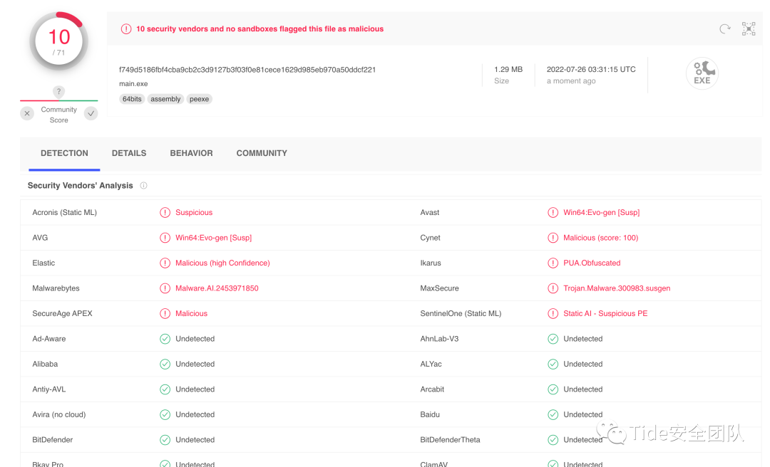 未使用沙箱检测技术的,VT查杀结果为:10/71