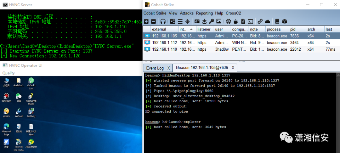 HiddenDesktop 在主机上创建HVNC客户端并使用rportfwd连接到服务器hd-launch 在指定的桌面上执行指定的程序和参数hd-launch-chrome 在指定桌面上打开谷歌浏览器hd-launch-cmd 在指定桌面上打开命令提示符hd-launch-edge 在指定桌面上打开Edge浏览器hd-launch-explorer 在指定桌面上打开资源管理器hd-launch-run 在指定桌面上打开运行对话框
