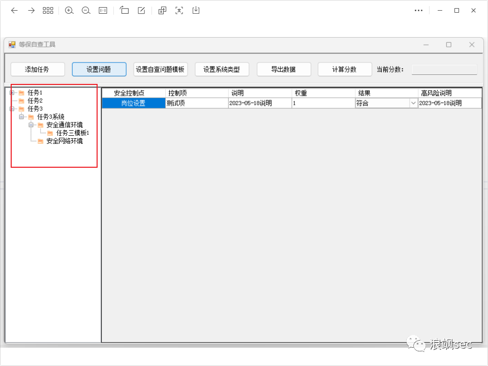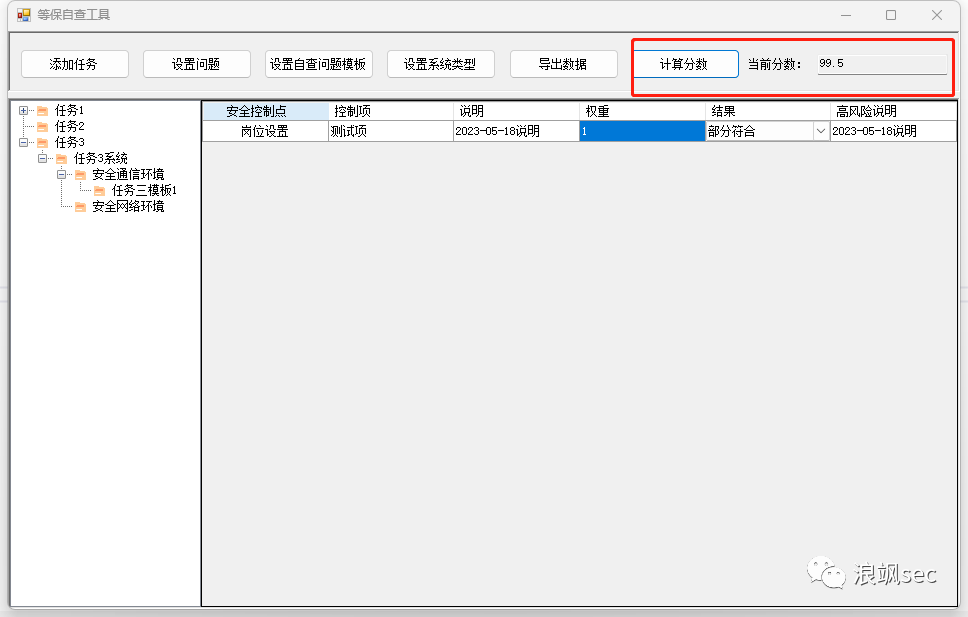本次升级新增功能一键算分,填完自查表后,可以在左侧树形图点击测评项或系统计算分数。如果点击系统,则会计算当前系统分数,点击测评项则只会计算该测评项得分。能够更清晰看到自己系统的风险等级。