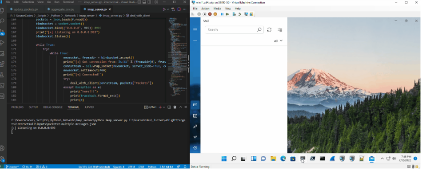 WindowsMail是与该模块交互的前端用户界面(UI),用户可以通过该界面设置IMAP帐户,并从邮件服务器下载邮件消息。在编写我们的IMAP客户端模糊器模块时,我们遇到了许多障碍,幸运的是,其中一些在项目的问题跟踪器中有部分记录。尽管大多数障碍都是针对于你所致力于的任何目标,我们认为记录这些挑战和我们的工作区可能会有所帮助。