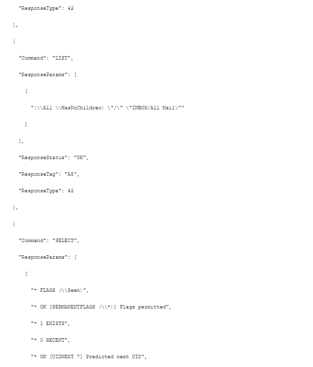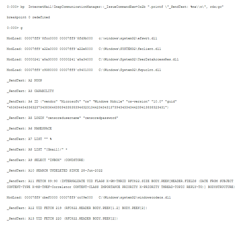IMAP包括创建、删除和重命名邮箱、检查新消息、永久删除消息、设置和清除标志以及选择性获取消息属性和文本的操作。因此,为IMAP协议实施一个全面的突变策略可能会耗时。在本例中,我们只关注Windows Mail用于与IMAP服务器交互的特定IMAP命令。首先,我们将WinDbg预览调试器附加到目标进程,以生成Windows Mail与真实的IMAP服务器(Gmail)交互的执行跟踪,以收集IMAP事务中的典型命令。清单1显示了调试器的输出,包括由Windows Mail客户机发送到Gmail服务器的IMAP命令。