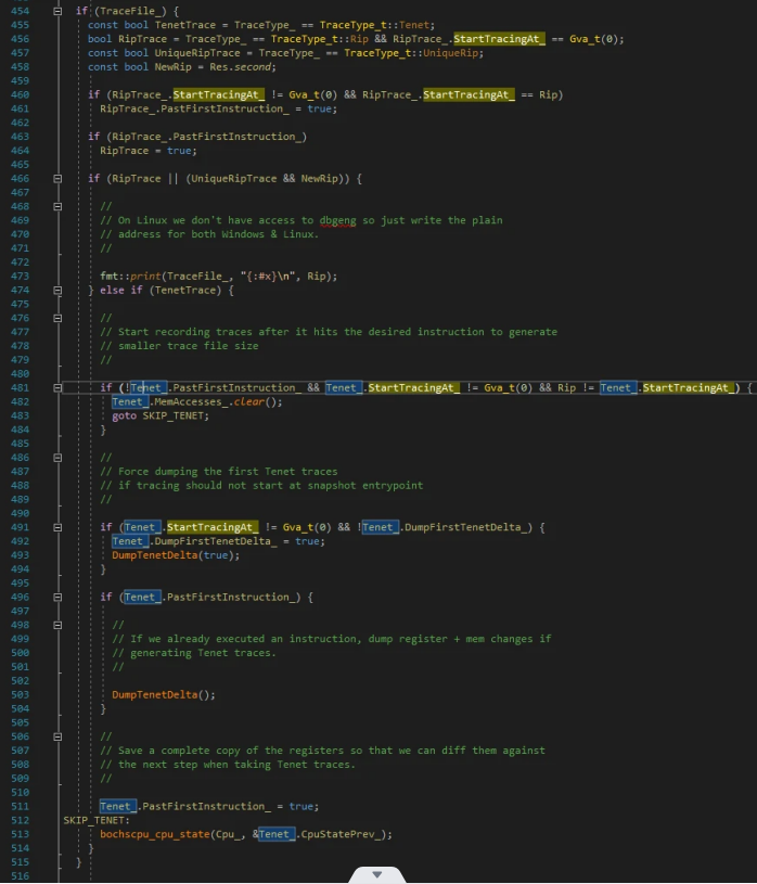 WTF模糊器支持两种类型的跟踪文件,覆盖跟踪日志和Tenet跟踪文件。基本上,覆盖跟踪日志包含模拟器正在执行的每条指令的跟踪。它有助于诊断大多数模糊器模块问题。Tenet跟踪文件包含每条执行的指令以及每条指令操作的内存/堆栈数据。Tenet插件只能使用一个Tenet跟踪文件。Tenet是一款出色的跟踪记录和回放IDAPro插件,可用于离线调试。WTF模糊器生成的Tenet跟踪文件可以通过IDAPro回放。这样,它允许用户探索已执行的代码,甚至分析读取/写入内存/堆栈的数据,从而使调试和故障排除模糊器模块变得更加容易。