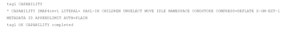 客户端通常发送的下一个命令是CAPABILITY。CAPABILITY命令允许客户端获取服务器支持的功能列表。未在未标记响应中列出的任何功能都将被标记响应中指示的服务器视为BAD命令。