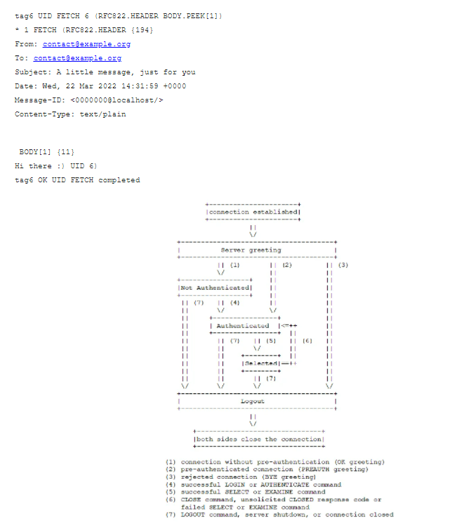 注意到服务器状态响应以“*”为前缀,称为未标记响应,表示服务器问候,或服务器状态不表示命令完成(例如,即将发生的系统关闭警报)。