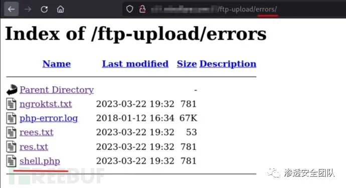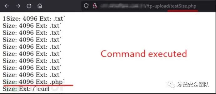 太棒了!名称中带有有效载荷的目录已经创建,现在需要运行带有易受攻击的函数的脚本,读取该目录的内容。为此,我们需要转到http://example.com/ftp-upload/testSize.php